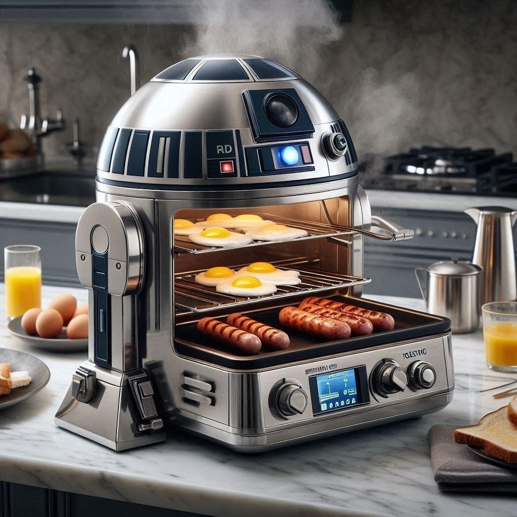 R2-D2 is arguably one of the most iconic droids in the Star Wars universe. A breakfast station modeled after R2-D2 is designed to be both functional and nostalgic. Key features include: A griddle plate that makes perfectly round pancakes with an R2-D2 design.